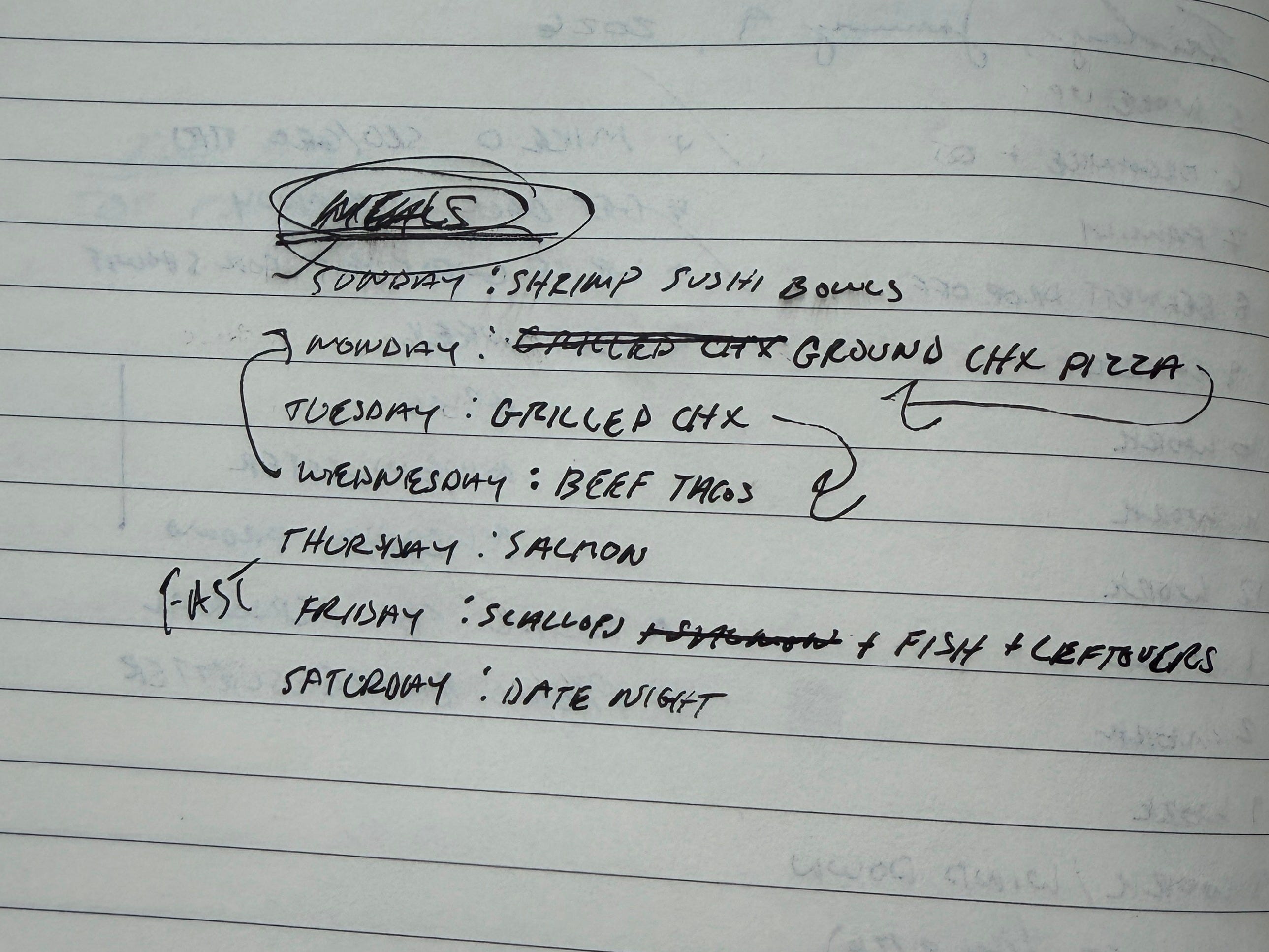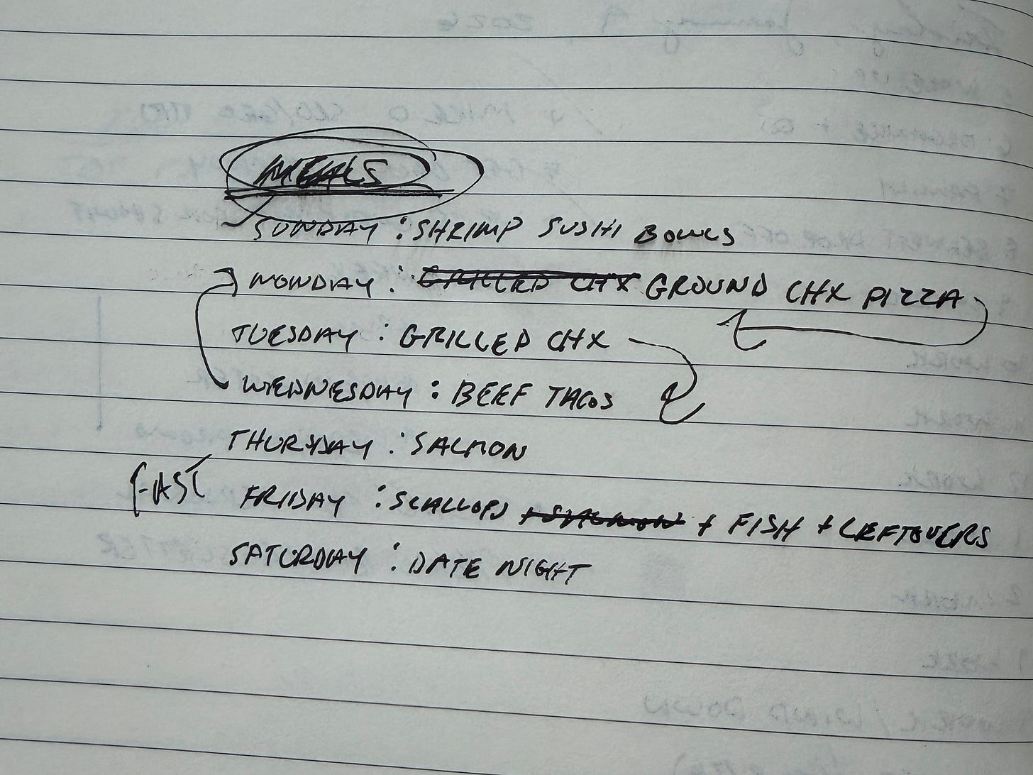 Quick Sunday conversation with Krista about what we’re eating for dinner that week. We take into account what we have going on each evening, like sports practices, so that we plan something appropriate.