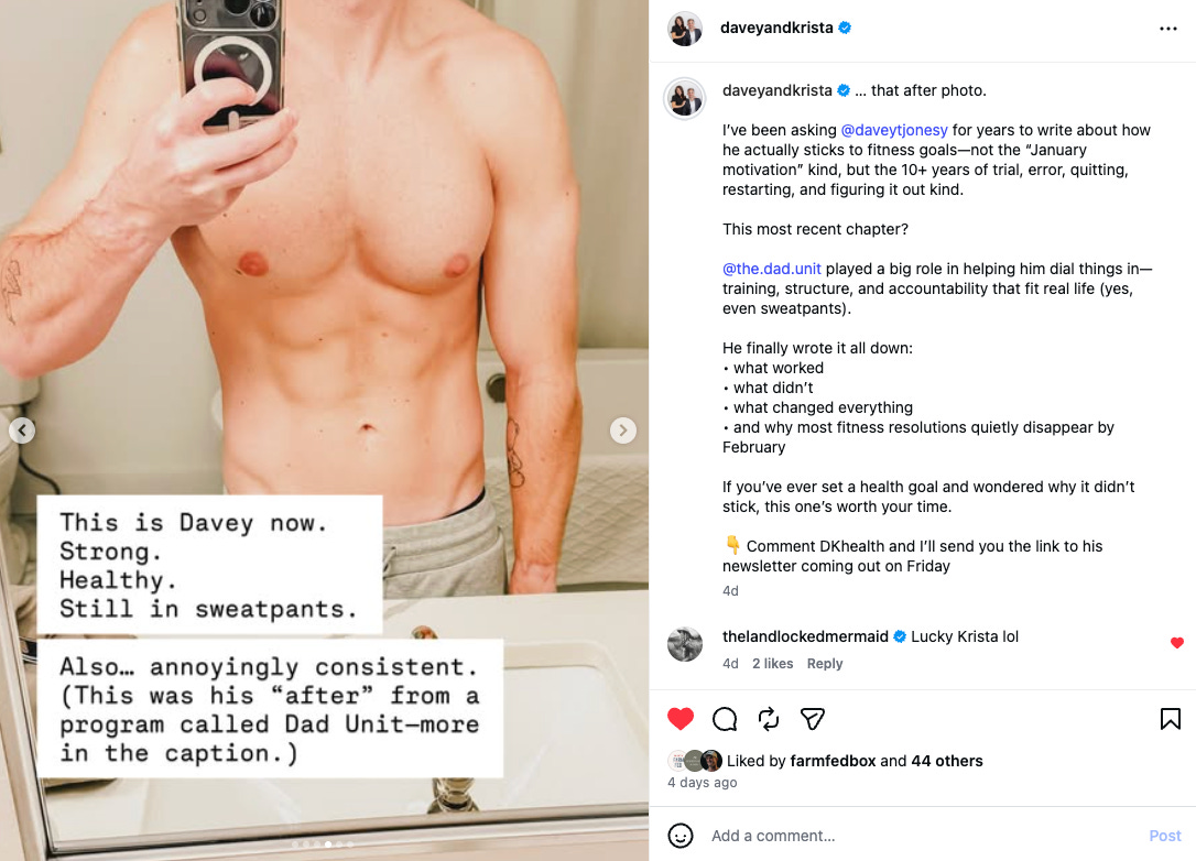 I’ve met weight and fitness goals on my own in the past, but some of the best progress I’ve ever made was through a program called Dad Unit with a few friends. This particular program runs 3 months, and you complete it as a cohort (or “unit”… s/o Team Helo). Knowing that a bunch of guys were ready to call you out if you didn’t “check the boxes” that day was highly motivating.